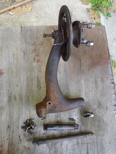 A navíc nějaké díly jsem odrovnal. Vzal jsem za zadní ramena a ejhle, trošku vakl. Jóó, koupím opravnou sadu a bude to.. Nebude, ramena jsem sundal celkem dobře, ale co jsem našel na rámu (koroze a trošku prasklinka), tak jsem ho zdemontoval taky. Jenže to už nebylo jen tak, chrup, chrup a urval jsem dva šrouby ok, co držej rám, noo a ještě jsem ty oka nemohl vycuknout ven (utržený šroub s okem vytvořil jeden matroš). Nakonec jsem sáhl po zbrani jménem bruska a zníčil oka, pak to už šlo ven. A nejvíc jsem si nadával, jelikož teď nemám kam našroubovat zpět šrouby. Vrchní jsou óká, ale spodní kaput - jen dírka. :blink: