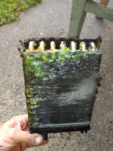 Vyndal jsem chladič (je v cajku), rozhodil, vypláchl a připravil jeho díly na lak. Tekla mi voda do kabiny, tak šlo ven topení. Závada se našla, dírka v chladiči topení. Dostane omlazovací kůru a novej chladič. Pak ještě pár drobností a ejhle, večer, čas ukončit práci a šup domů. Končí mi dovolená, tak už nebude tolik času.. :(
