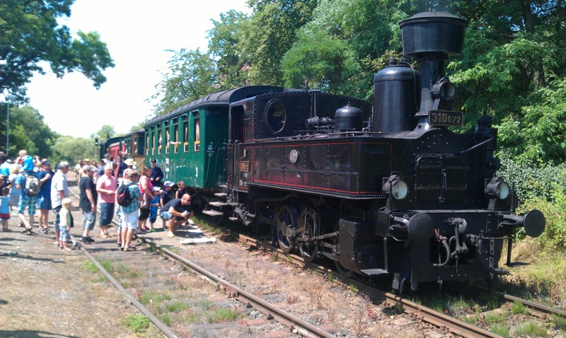 Cíl orientační rally nás zavedl do jedné zapadlé železniční stanice, kde „bez prdele“ končily koleje.. a tak si každý vlak musel přepřahat. Shoda náhod a Jirka Plevka tomu chtěli, že se zrovna v našem cíli konala oslava 110let tamní železnice, takže sláva veliká.. nadšenci dráhy si mohli prohlédnout pojízdná muzea.. Zkusit přesvědčit průvodčího, že za lístek platit nemusí, že má účastnickou placku anebo za 80Kč podniknout cestu parní mašinkou jak z pohádky do nedaleké stanice, kde nám pauzu zpříjemnily charleston nebo swing tanečnice.. (kdo poznal nechť mě opraví.. já umím jen šlapáka