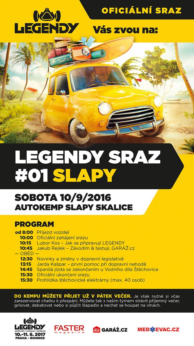 Dovolte mi, abych Vás pozval na první sraz LEGENDY v krásném prostředí Slapské přehrady. Oficiálně sraz s programem začíná až v sobotu od rána, ale náš kompletní realizační tým bude na místě již od pátečních odpoledních hodin. Proto přijměte pozvání, vezměte rodiny a drahé polovičky a dorazte v pátek 9.9. odpoledne do Autokempu Slapy Skalice. Budeme grilovat, pít a strávíme velmi příjemný večer.
