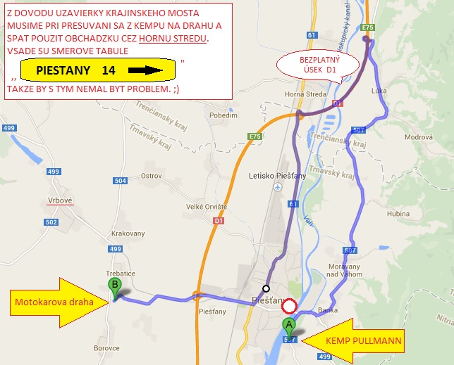 gjarino@gmail.comp.s: počas celého leta, prebieha v Piešťanoch rekonštrukcia Krajinského mosta (ponad rieku Váh), takže pri presúvaní kemp-dráha bude treba použiť obchádzku cez Hornú Stredu po D1 (bezplatný úsek) je to kratšie. Alebo cez Hlohovec.