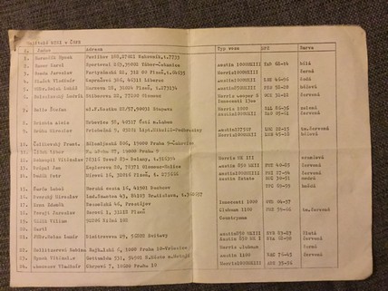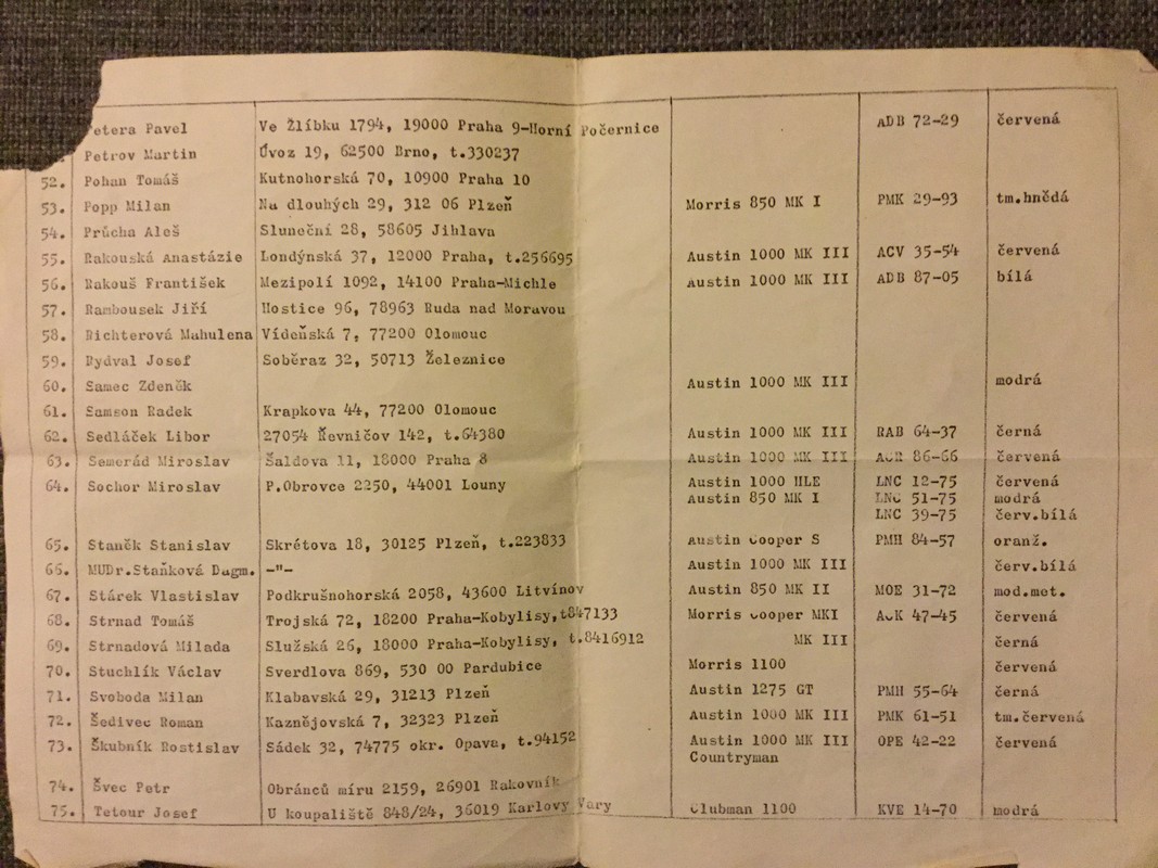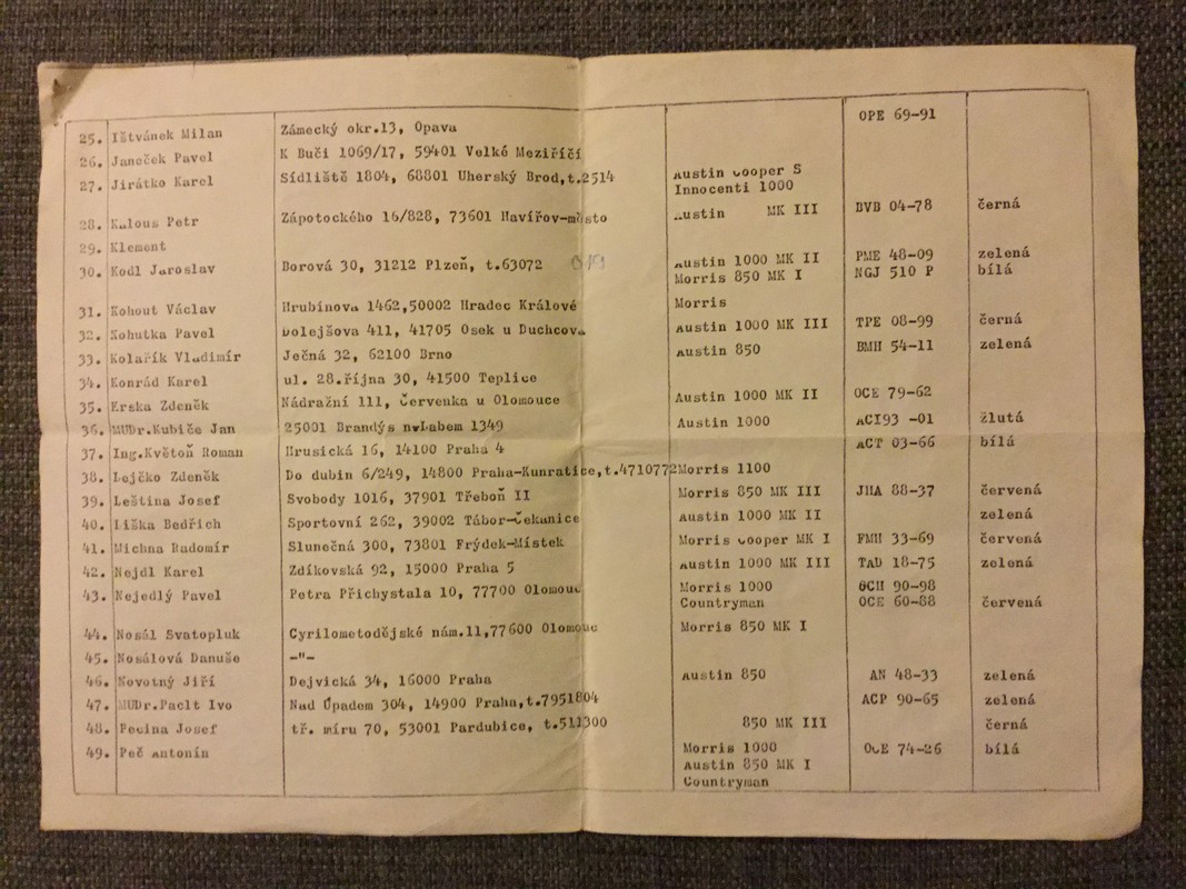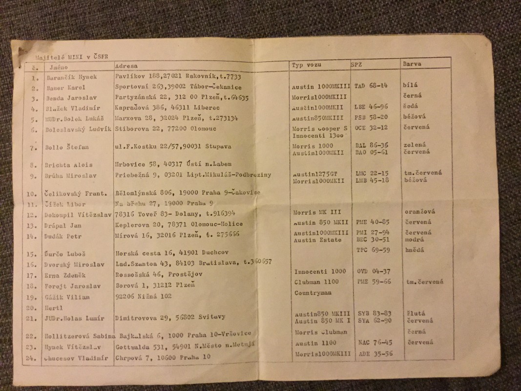 Pri upratovaní garáže sme našli tento zaujímavý zoznam ktorý robil p. Kodl z Plzne. Tak kto sa tam nájde alebo svoje MINI. Pár Vás tu je na fóre ktorý si pamätejú tieto časi.