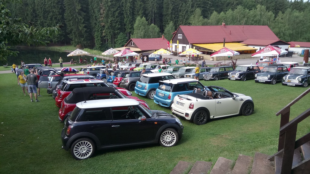 Páteční cestu jsme naplánovali tak, že Pumík na své pouti z východního Slovenska jakmile bude někde poblíž, dá vědět a pokusíme se spojit. V Novém Jičíně jsme se nakonec potkali a vytvořili tandem dvou "Electric Blue" R53.. jasně.. mohl jsem jet i klasikem, ale když ono bylo docela horko a já se za Váma fakt moooc těšil, tak jsem nakonec zvolil cestu na sraz s New Mini. Ono i svým pojetím je "Sraz fóra" taková dýmka míru, kde se nedbá na to, jestli jsi přijel veteránem nebo autem vyrobeným po roce 2001. Jde o to se bavit se stejně postiženýma lidma, poznávat se a užívat si prima víkend.
